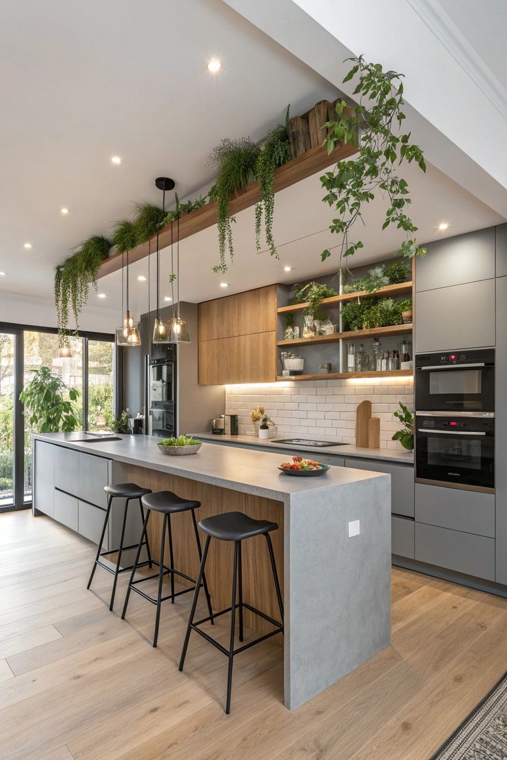 Pot choice matters too. Textured, ceramic, or colorful planters can add another layer of design, especially if your kitchen is neutral. Mixing pot sizes creates visual depth, but keeping the palette consistent helps the arrangement feel tidy. Overall, greenery is a simple upgrade that makes an open kitchen feel more comfortable, lived-in, and inviting.
