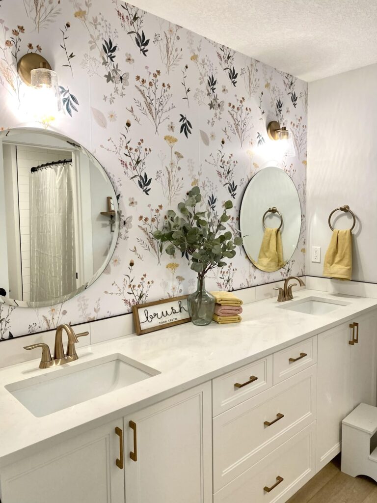 If your bathroom has harsh lighting, botanical wallpaper helps soften it. It adds warmth without making the room darker.