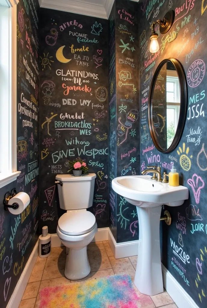 Okay, hear me out, chalkboard wallpaper in a bathroom is way more fun than it sounds. It turns the room into a little interactive space, where you can leave notes, draw something goofy, or write reminders you’ll actually see.