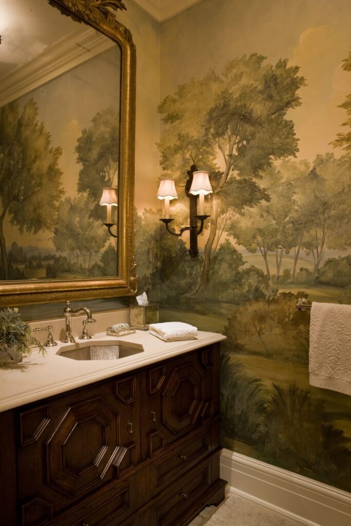I’d keep decor to a minimum and let the mural be the star. Clean countertop, simple mirror, neutral towels. If you want to add one extra touch, choose a towel color that matches one shade in the mural so it feels intentional.