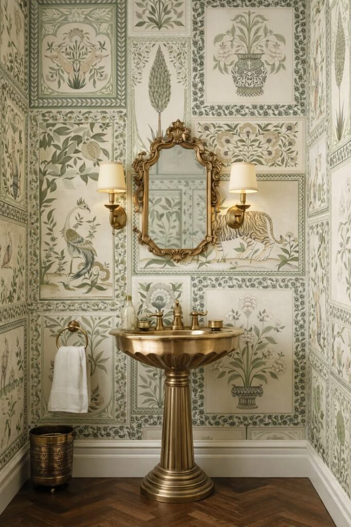 I’d pair it with clean fixtures and maybe one metallic accent, like a gold tray or a warm mirror frame. The wallpaper is already doing a lot, so your job is to not fight it with extra patterns.