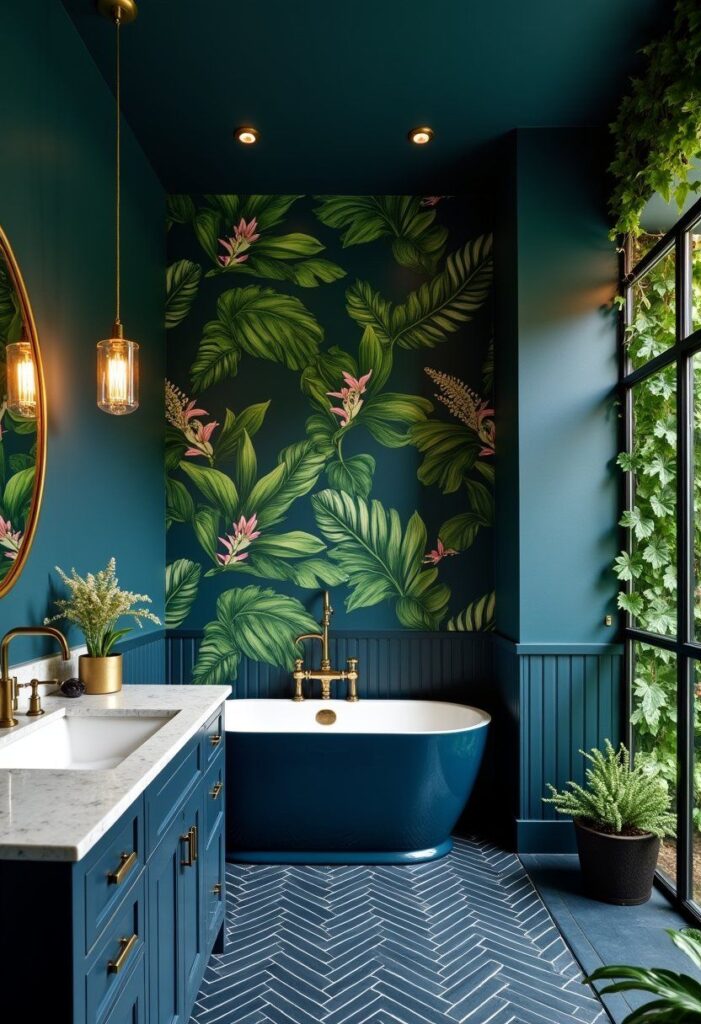 This is for the person who wants their bathroom to feel like vacation, even on a random Tuesday. Tropical wallpaper brings instant energy, and in a small bathroom, it’s kind of perfect because you’re not staring at it all day, you’re just getting a quick hit of color.