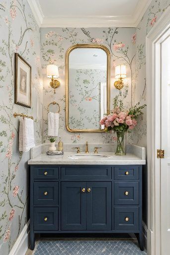 The trick is balancing it. Keep the toilet and sink white, keep your storage tidy, and let the wallpaper do the talking. If you want to lean into the vintage vibe, a brass sconce or an old-school soap dish looks so good here.
