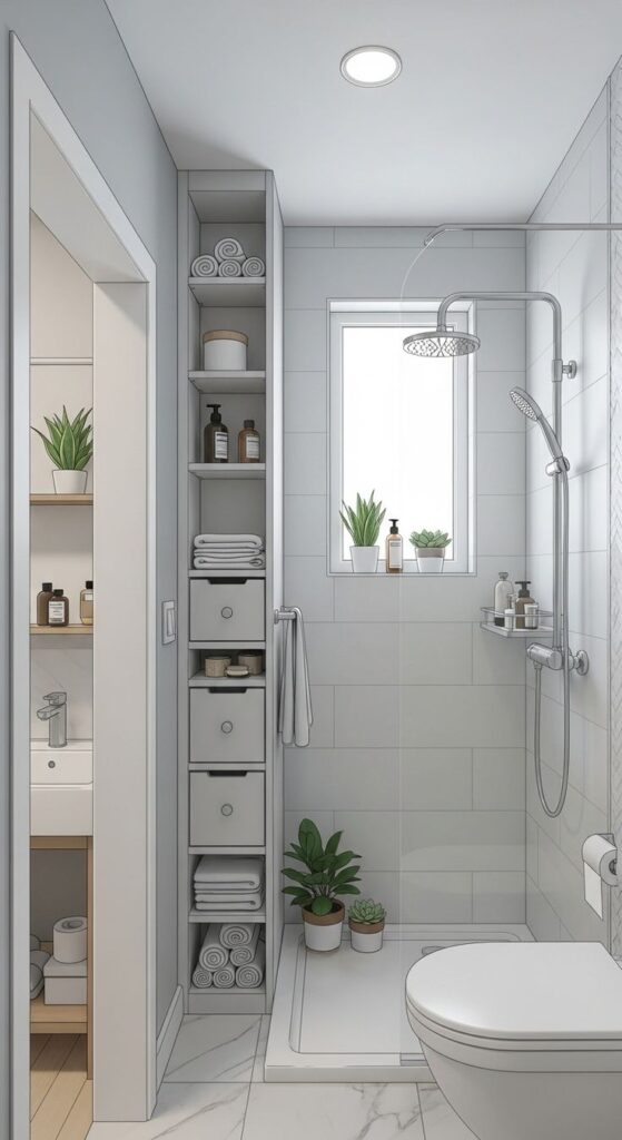 A slim tower next to the tub is especially helpful for towels and bath products. If you want it to look calmer, use matching containers so your shelves do not turn into a lineup of random bottles.