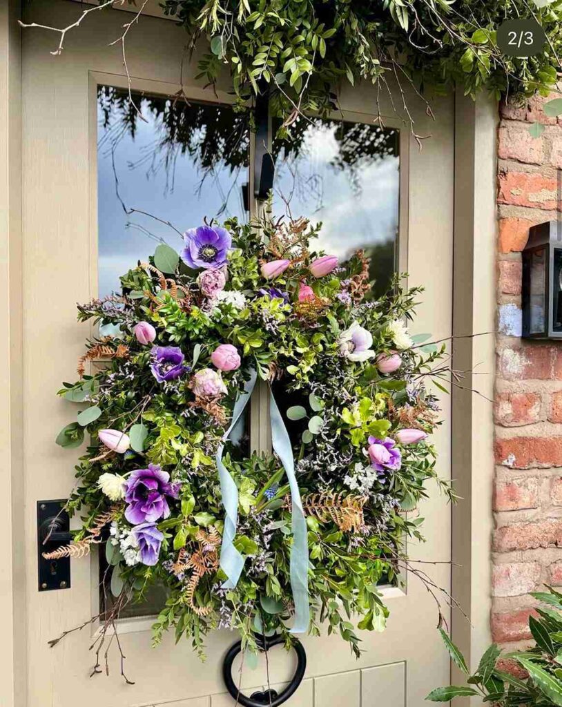 A full wreath packed with greenery and soft colored flowers becomes the main feature on the door. Purple and pink blooms stand out against the neutral background and add a fresh seasonal feel.