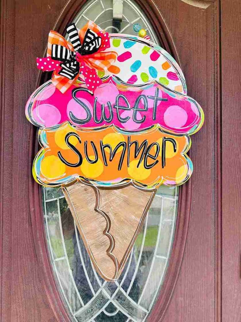 When summer rolls around, nothing beats a cool, refreshing ice cream cone. A door hanger designed to look like a giant ice cream cone will instantly evoke those fun, sweet, and nostalgic feelings of hot summer days spent enjoying a frozen treat. Whether you choose a classic cone with a swirl of vanilla or get creative with multiple scoops of various colors, this design adds a playful, sweet touch to your front door.
