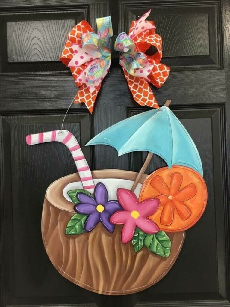 Watermelon is a quintessential summer fruit, making a watermelon slice door hanger an excellent choice to capture the refreshing and fun vibe of the season. With its bright red, pink, and green colors, a watermelon slice design will instantly add a burst of color to your entrance. Whether you opt for a realistic depiction or a more abstract, graphic version, this design brings a playful touch to your front door.