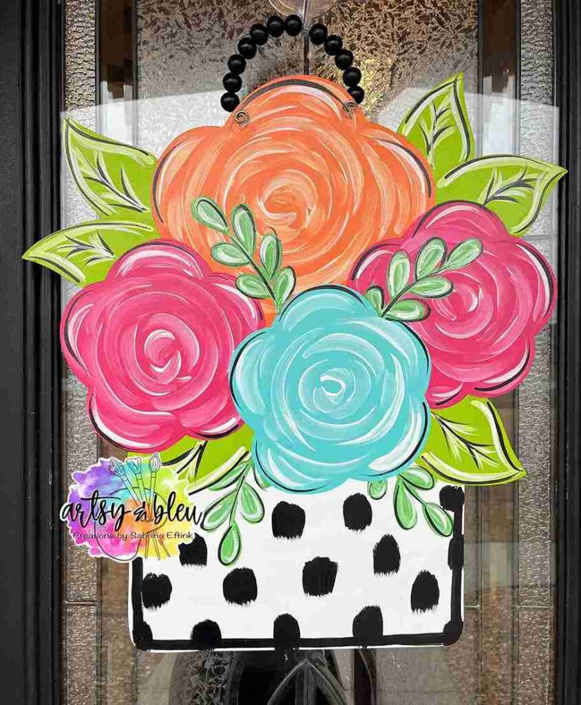 This door hanger design works well in family-friendly homes, gardens, or homes with a vintage-inspired back porch décor. It’s a great choice if you want to evoke feelings of childhood nostalgia while adding charm and personality to your entryway.