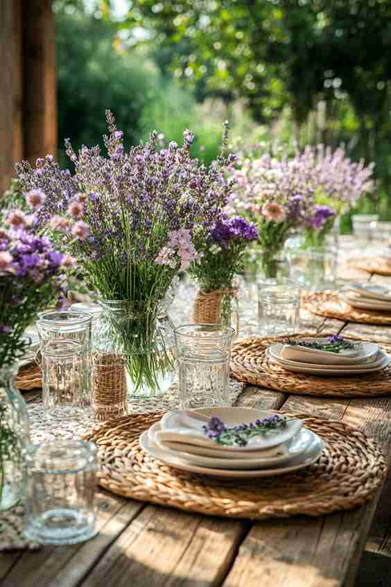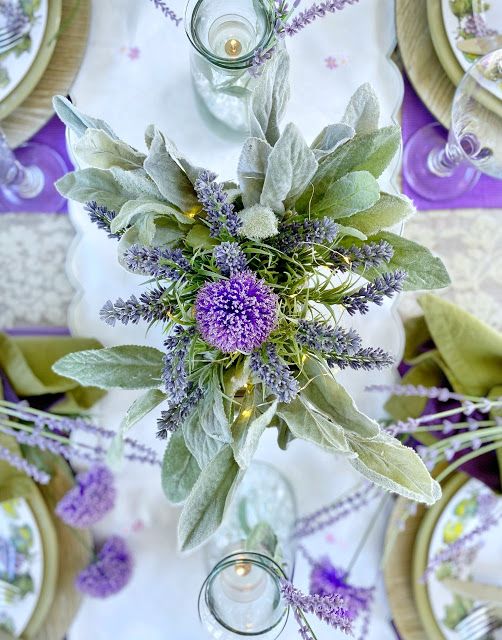 To begin, use a light lavender-colored tablecloth or runner to bring out the natural beauty of the lavender theme. Consider placing several small vases filled with fresh lavender sprigs along the center of the table, either individually or in clusters, to create an enchanting floral display. If fresh lavender isn’t available, you can use faux lavender or even lavender-scented candles to capture the calming essence of the plant.
