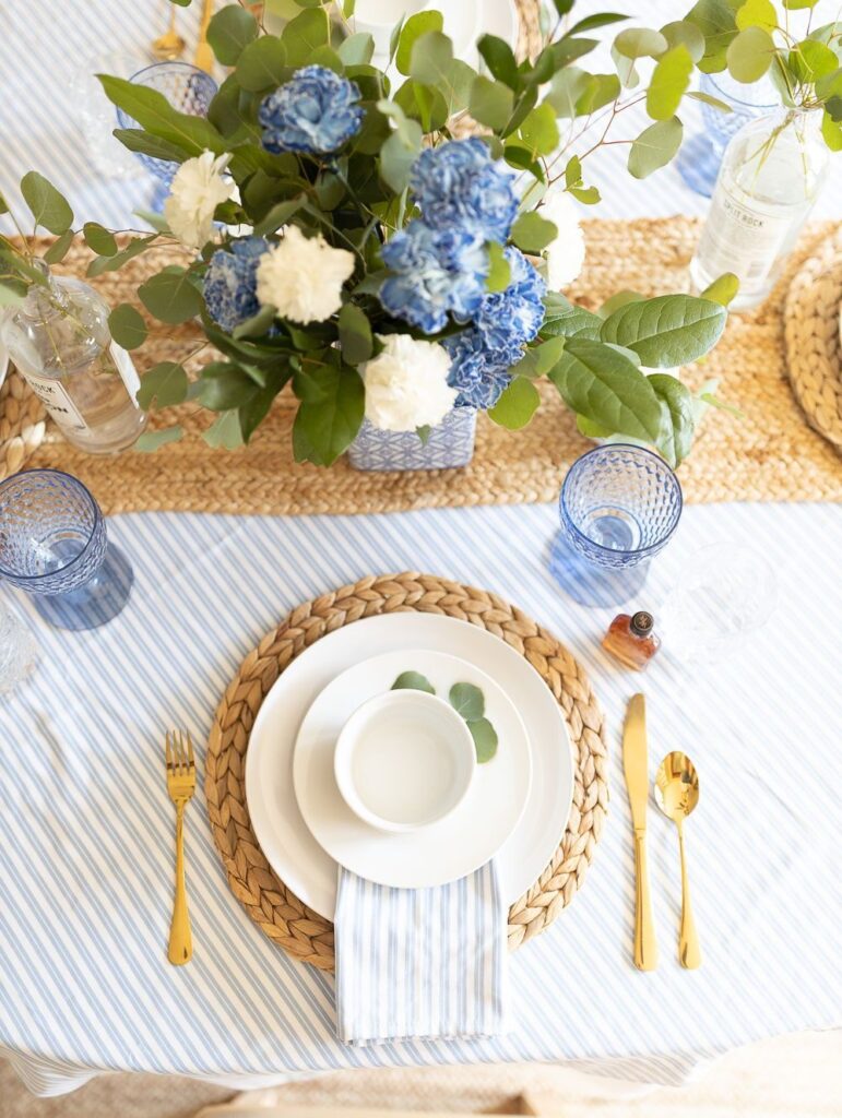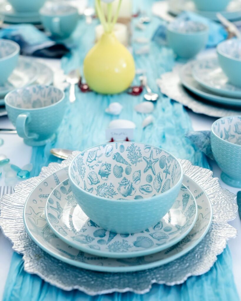For the finishing touch, consider a touch of metallic, like gold or silver flatware, to bring a touch of elegance to this laid-back style. Your guests will feel like they are dining by the sea, even if they’re just on the porch!