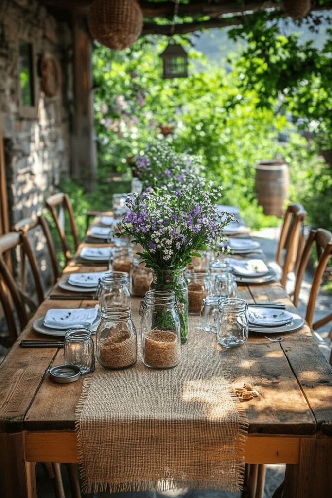 Start with a wooden or reclaimed wood table for an authentic, rustic foundation. You can use a checkered or gingham tablecloth in muted shades of red, blue, or beige to add a touch of country charm. For the centerpieces, opt for mason jars filled with fresh wildflowers or baby’s breath. Wooden crates, burlap runners, and galvanized steel pitchers can also be used to enhance the farmhouse vibe.