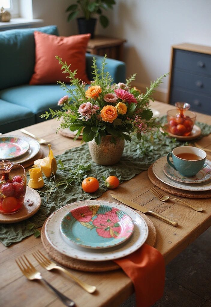 Your dinnerware should reflect a vintage vibe, with colorful ceramic plates or mismatched china for an eclectic look. Consider using glassware that mimics vintage milk glass, and complete the look with simple silver or wooden flatware. For a final touch, tie linen napkins with a piece of twine or ribbon for that homemade, rustic feel.