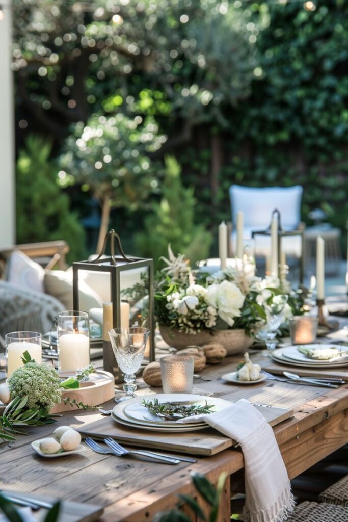 Your dinnerware should lean toward simplicity, with ceramic or stoneware plates in neutral tones such as white or gray. Add texture with woven placemats and cloth napkins, folded simply for a clean, no-fuss presentation. Finish the look with rustic candleholders, perhaps even some vintage lanterns, to add a soft glow to the evening.