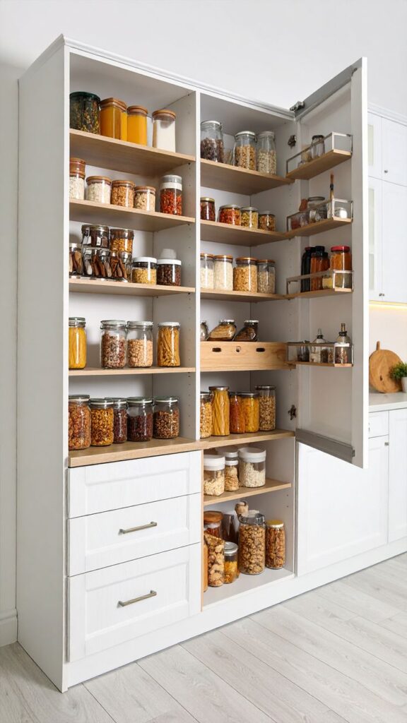 In this pantry, you can see a mix of vintage-style jars and modern containers. The labels are clear, helping you find what you need quickly. This organization not only saves time but also adds a touch of nostalgia to the kitchen. The use of baskets at the bottom adds texture and warmth, making the pantry feel inviting.