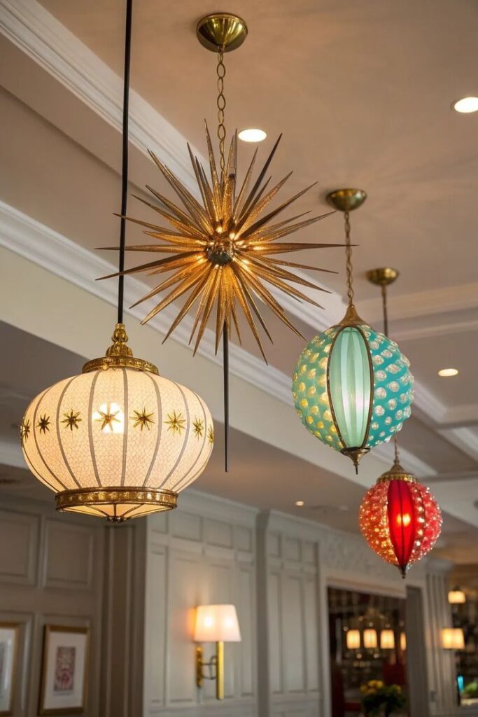 Each light fixture serves a purpose beyond just illumination. They create focal points that draw the eye and enhance the overall decor. The mix of shapes and colors reflects the playful spirit of the era, making the kitchen not just a place for cooking, but a lively gathering spot.