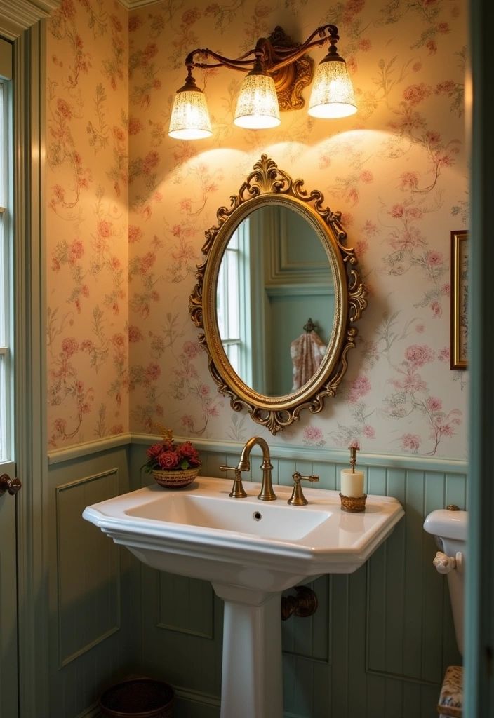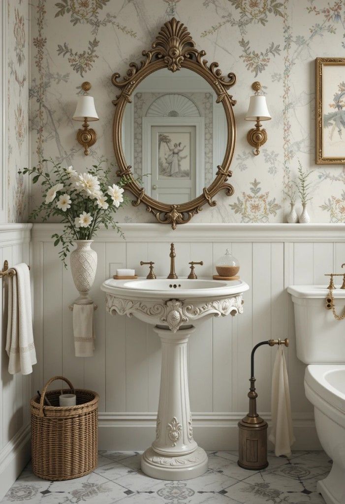 A Victorian mirror isn’t just there to check your hair. It’s the jewelry of the bathroom. The ornate frame, the curves, the gold details, all of it adds this sense of elegance without needing a lot of extra decor.