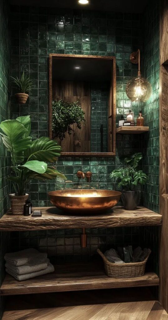 Gold accents are the classic partner here, but even warm brass works. And patterned floors? They’re basically the cherry on top. Just make sure you balance bold color with lighter pieces like white tile or a bright sink so it doesn’t feel heavy.