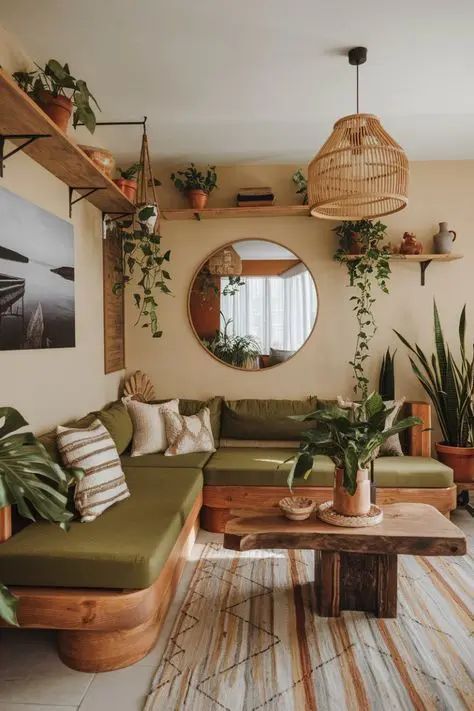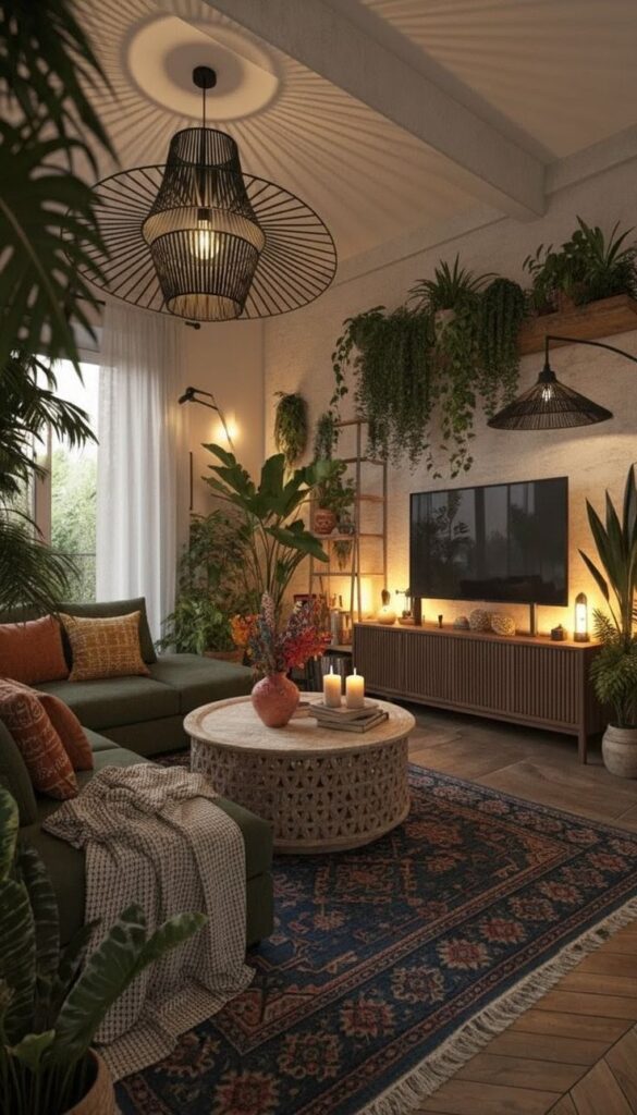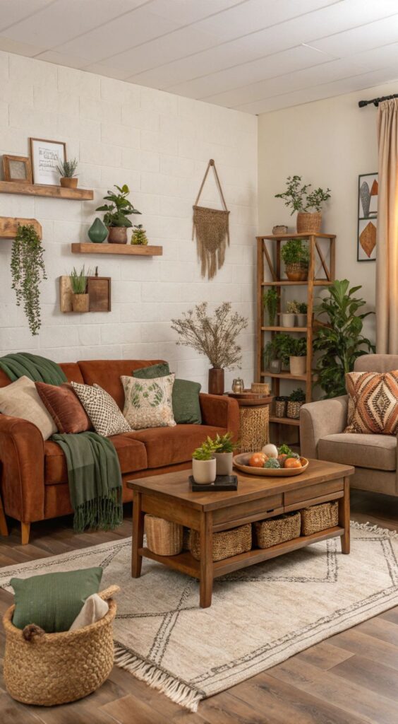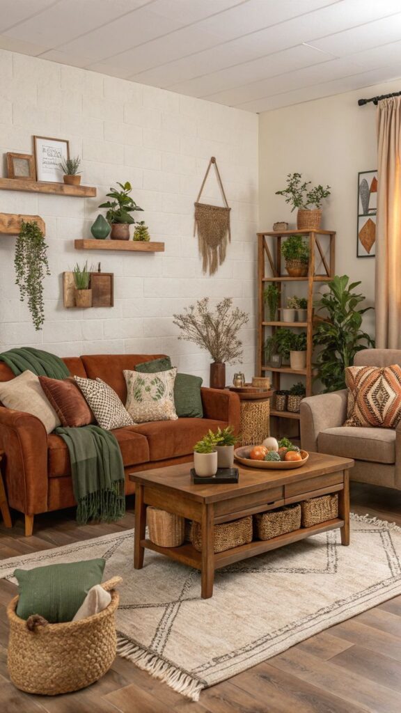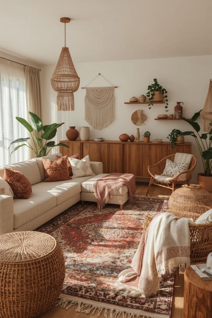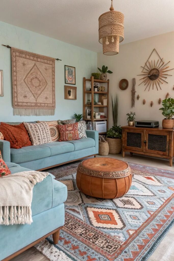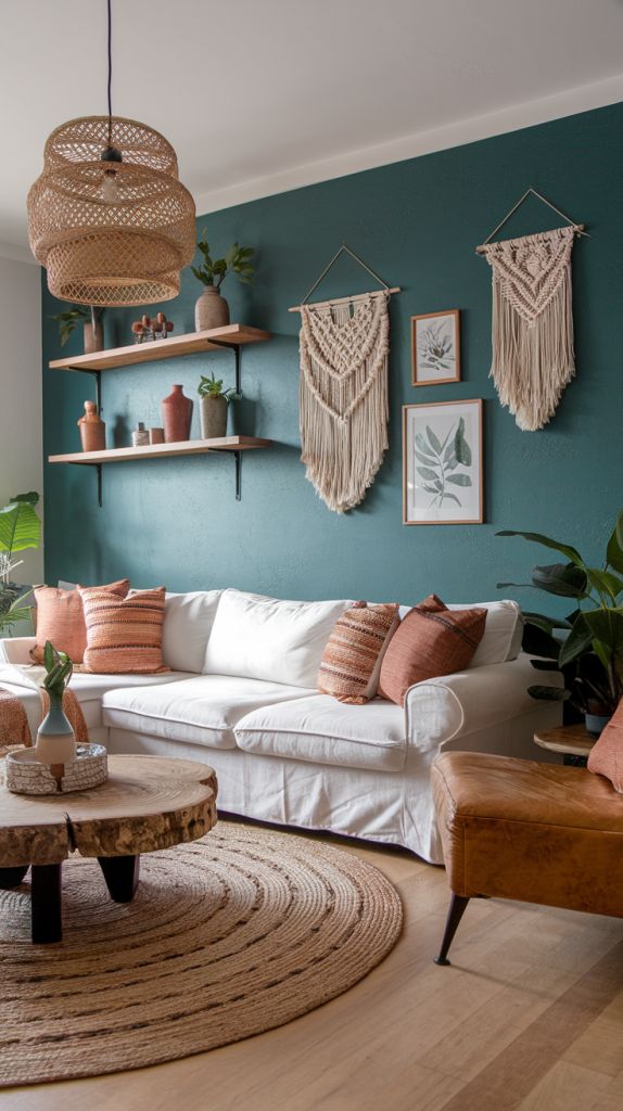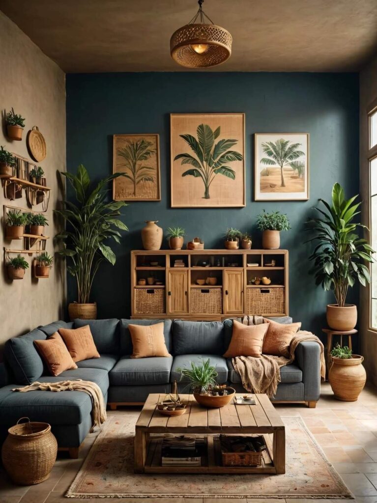 Living room boho can handle deeper tones. Warm browns, moody blues, earthy greens, layered neutrals. It is a room meant for lingering.