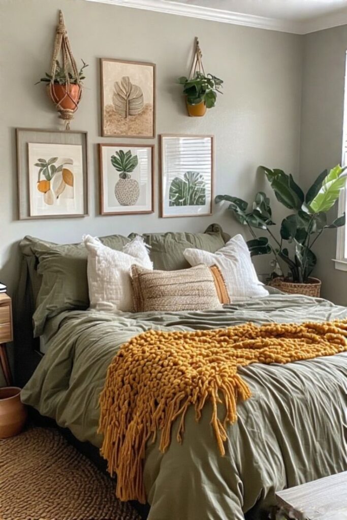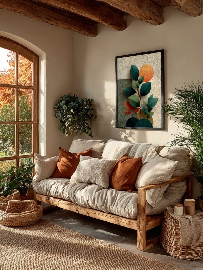 - Accents: Sage pillows, muted mustard throw, earthy art
