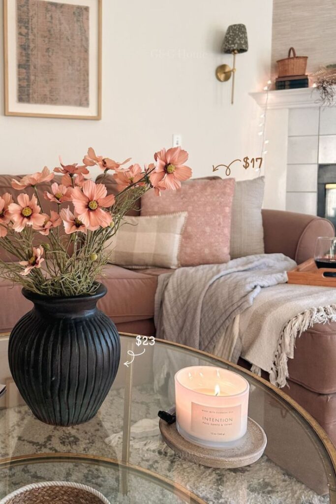 - Accents: Dusty blush textiles, warm art tones