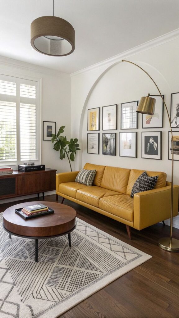 Keep mustard limited to smaller touches so the room remains balanced.