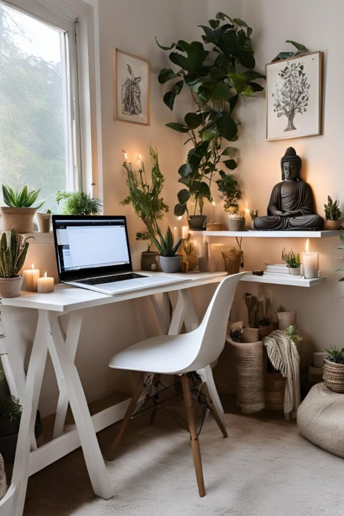 One larger piece behind your desk often looks more Zen than a busy gallery wall. Nature scenes, soft abstracts, botanical prints, or muted typography can all work, as long as it is not visually loud.